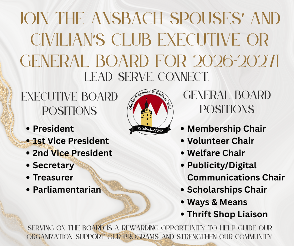 President: Leads ASCC by presiding over meetings, appointing committee chairs, overseeing board and committee activities, managing organizational accounts and financial oversight, approving contracts and major actions, and ensuring compliance and smooth board transitions. Oversees the Executive and General Boards, programs, and fiscal operations of both the Ansbach Spouses’ and Civilian’s Club and Thrift Shop.