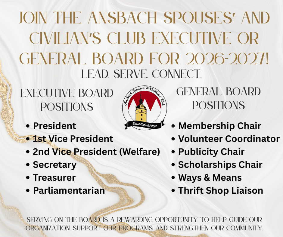 President: Leads ASCC by presiding over meetings, appointing committee chairs, overseeing board and committee activities, managing organizational accounts and financial oversight, approving contracts and major actions, and ensuring compliance and smooth board transitions. Oversees the Executive and General Boards, programs, and fiscal operations of both the Ansbach Spouses’ and Civilian’s Club and Thrift Shop.