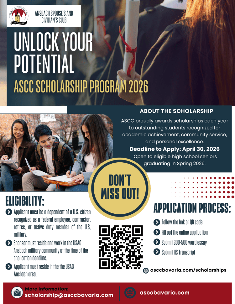 The Ansbach Spouses’ and Civilian’s Club (ASCC) proudly awards annual scholarships to outstanding students within the USAG Ansbach community. The current program recognizes graduating seniors who demonstrate academic achievement, community involvement, leadership, and personal excellence.